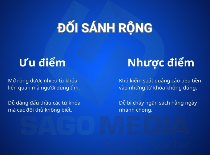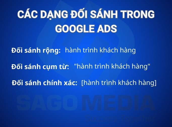 Các loại từ khóa Google Ads hiện đang có bao gồm: Đối sánh rộng, đối sánh cụm từ, đối sánh chính xác. Trong bài viết hôm nay SAGO MEDIA sẽ trình bày với các bạn từng loại đối sánh trên và đưa ra lời khuyên nên lựa chọn loại đối sánh như thế nào sẽ tiết kiệm chi phí.