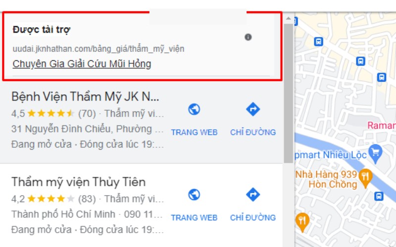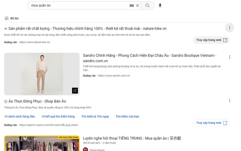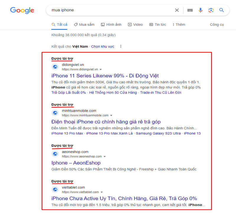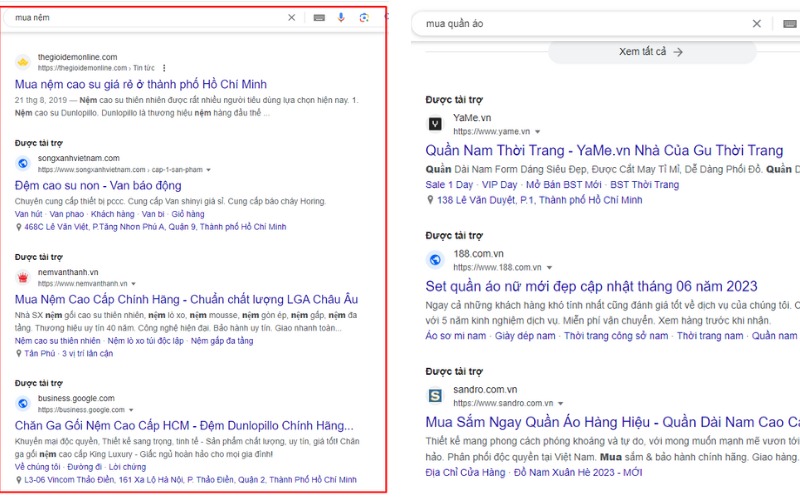 Ví dụ khi quảng cáo Google được hiển thị trên công cụ tìm kiếm của Google Search