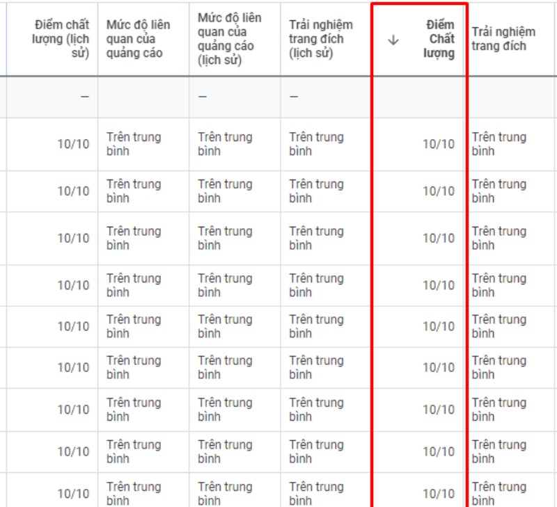 Điểm chất lượng được xếp hạng trên thang điểm từ 1 đến 10. Điểm chất lượng càng cao chứng tỏ bạn có cơ hội hiển thị quảng cáo ở vị trí càng cao với chi phí càng thấp.