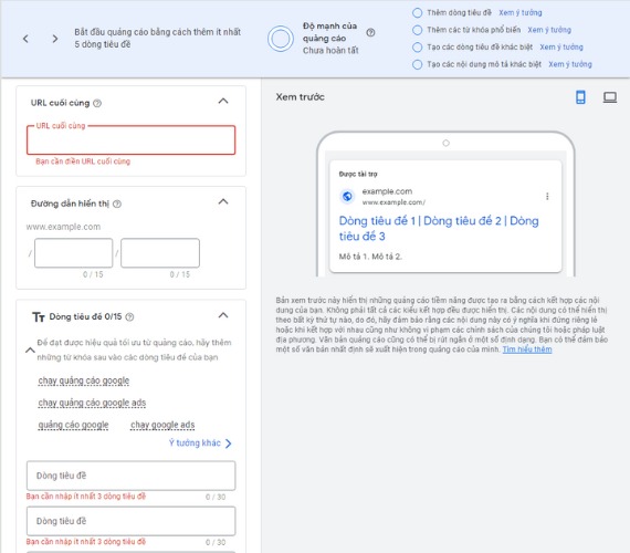 Tiếp theo nhà quảng cáo điền các dòng tiêu đề và mô tả cho quảng cáo của bạn. Lưu ý nên điền để độ mạnh của quảng cáo luôn đạt được từ "Tốt" trở lên quảng cáo mới phát huy được hết hiệu quả.