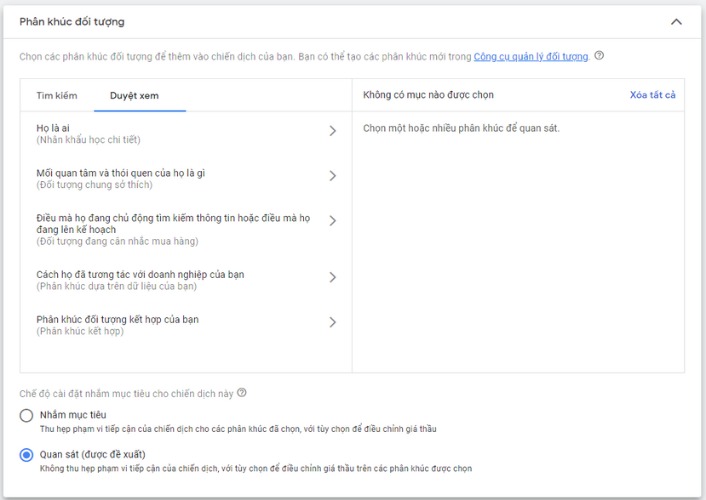 Phân khúc đối tượng: Nhà quảng cáo có thể target quảng cáo của mình đến hành vi, nhân khẩu học của khách hàng.