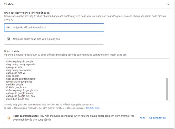 Nhập các dạng kiểu khớp của từ khóa vào hoặc nhà quảng cáo cũng có thể dán url vào phần nhập url để google sẽ quét những từ khóa phù hợp trong page.