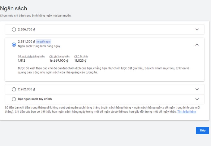 Ngân sách: Điền vào ngân sách mà nhà quảng cáo đã phẩn bổ