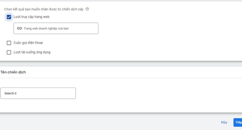 Ở ngay phía dưới, bạn có thể chọn mục tiêu bạn mong đợi nhận đc từ loại chiến dịch search theo 3 ô tick chọn bên dưới.