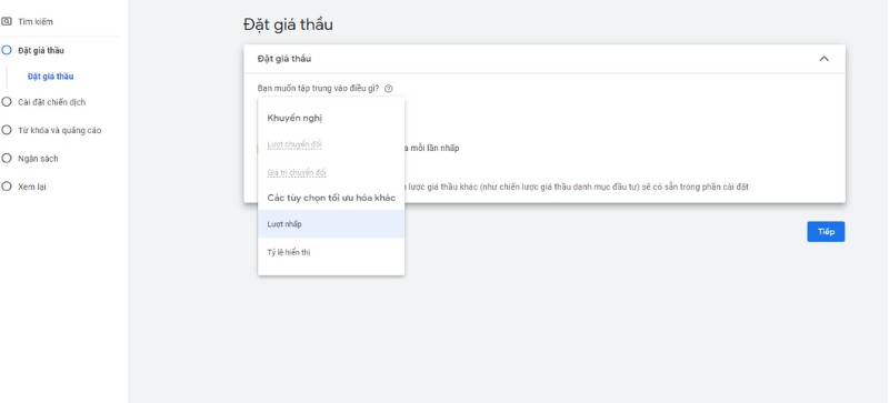Đặt giá thầu: nhà quảng cáo có thể lựa chọn chiến lược đấu thầu gồm lượt nhấp, tỷ lệ hiển thị. Để lựa chọn lượt chuyển đổi, giá trị chuyển đổi thì bạn phải cài đặt chuyển đổi trước khi lựa chọn. Thông thường các bạn mới chạy không cài đặt chuyển đổi bạn hãy chọn chiến lược đấu thầu lượt nhấp thay vì những kiểu chiến lược đấu thầu truyền thống. Điều đó để Google có thời gian tìm hiểu học hành vi khách hàng qua những lượt nhấp từ quảng cáo của bạn trước khi bạn chọn loại đấu thầu khác ngoài target CPA, hay là các loại đặt thầu chuyển đổi.