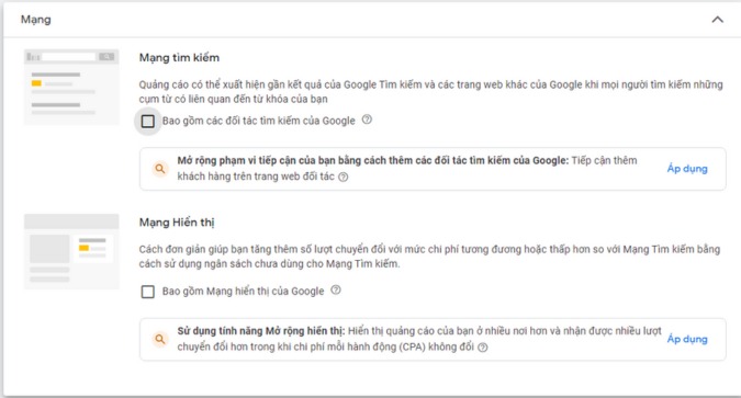 Mạng: Mạng tìm kiếm và Mạng hiển thị giúp cho quảng cáo của bạn xuất hiện trên các đối tác bên ngoài của Google. Bạn có thể lựa chọn hoặc bỏ tùy vào ngân sách chi tiêu hằng ngày của bạn.