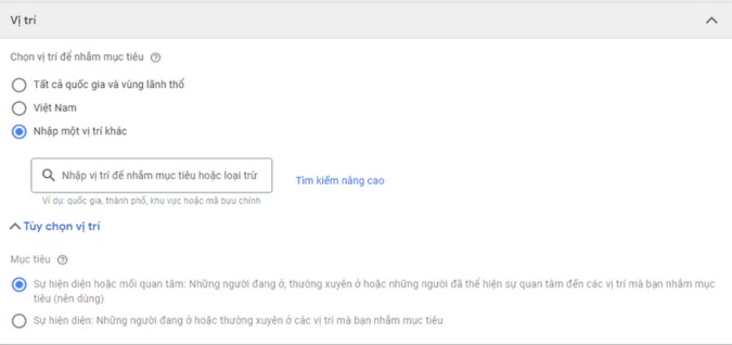 Vị trí: Lựa chọn địa điểm bạn muốn khách hàng tại đó có thể thấy quảng cáo của bạn. Ở phần tìm kiếm nâng cao bạn có thể chủ động lựa chọn bán kính từ xung quanh địa chỉ bạn muốn khách hàng tại đó thấy quảng cáo